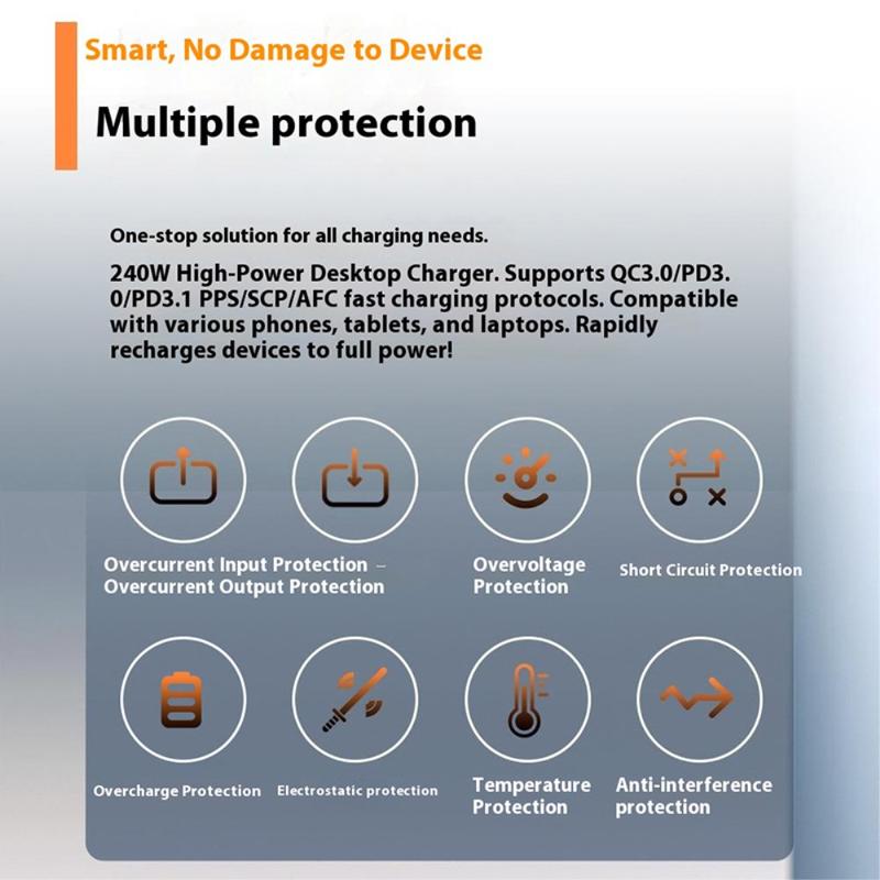 PD 3.1-teknologien gir en utgangseffekt på opptil 240W - nok til å lade ikke bare telefoner, men til og med bærbare datamaskiner med høy ytelse og bærbare spillkonsoller - samtidig som sikker temperatur- og spenningsregulering opprettholdes for å forlenge enhetens levetid.