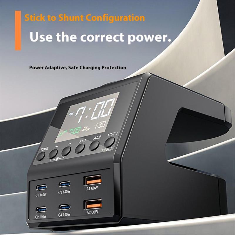 Denne stasjonen er utstyrt med fire Type-C-porter (hver med støtte for opptil 140 W) og to USB-A-porter (opptil 60 W), slik at du enkelt kan lade seks enheter samtidig. Alle portene er konstruert for maksimal ytelse og energidistribusjon, fra bærbare datamaskiner og nettbrett til wearables og tilbehør.