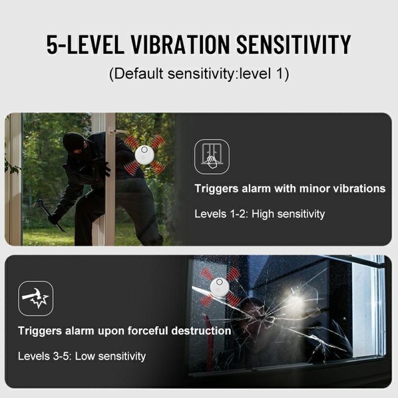 Sikre hjemmet, kontoret eller butikken med denne høysensitive dør- og vindusalarmen, som er utformet for å oppdage vibrasjoner, støt eller glassknusing. Med en justerbar sirene på 130dB, justerbare følsomhetsnivåer og enkel installasjon uten bruk av verktøy, er dette en pålitelig og rimelig sikkerhetsløsning mot inntrengere.