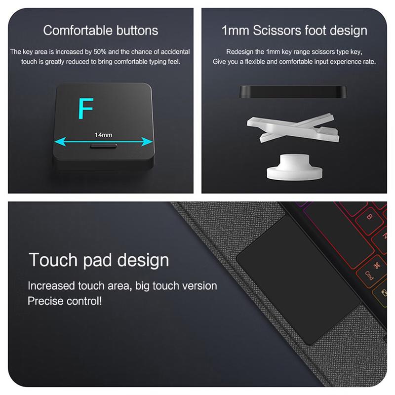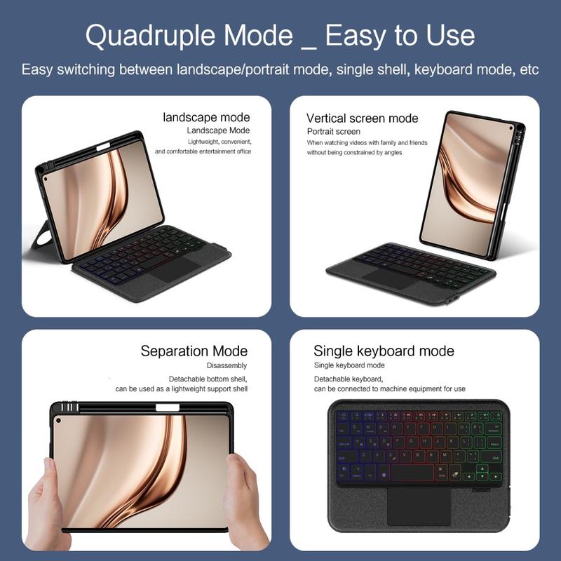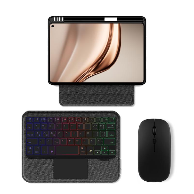 Gjør din Huawei MatePad Mini enda bedre med Bluetooth-tastaturetuiet, et multifunksjonelt 2-i-1-tilbehør som kombinerer beskyttelse, produktivitet og stil. Dette elegante etuiet er laget av førsteklasses polyuretan og gir full beskyttelse mot riper, støt og fingeravtrykk, samtidig som det opprettholder et profesjonelt utseende. Det avtakbare Bluetooth-tastaturet kobles trådløst til for smidig og responsiv skriving, mens den integrerte berøringsplaten støtter flerbevegelseskontroll for uanstrengt navigering. Tastaturet har bakgrunnsbelysning, slik at du kan skrive komfortabelt selv i omgivelser med lite lys. Det innebygde justerbare stativet gir en ergonomisk synsvinkel, noe som gjør den perfekt for skriving, strømming eller lesing. Dette tastaturetuiet er designet for forretningsbruk, reiser eller hverdagsbruk, og forvandler nettbrettet ditt til en bærbar arbeidsstasjon.