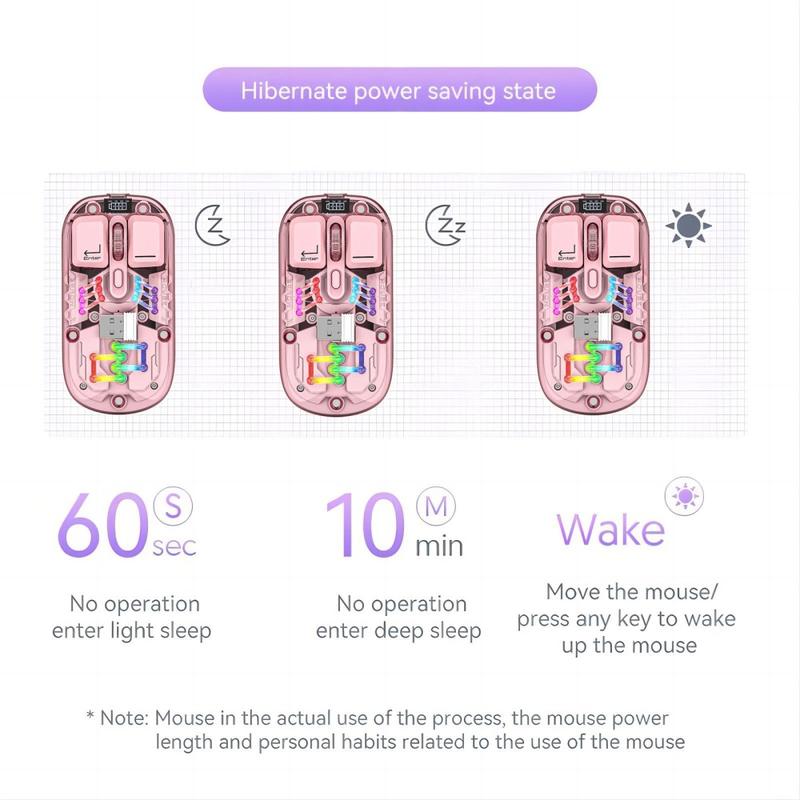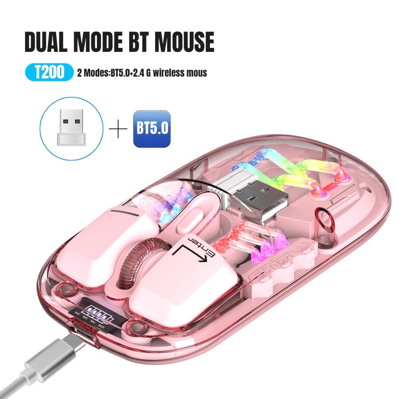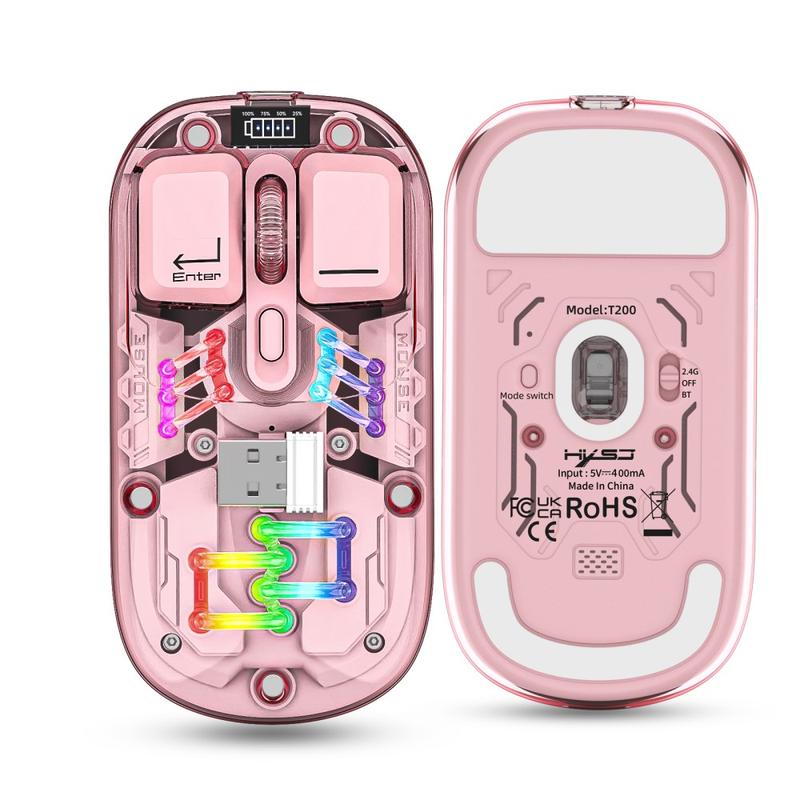 HXSJ T200 Wireless Bluetooth Mouse har dobbel tilkobling via Bluetooth og 2,4 GHz trådløst, noe som gir støtte for samtidig tilkobling til to enheter. Denne musen er laget av gjennomsiktig PC-materiale med RGB-belysning som kan tilpasses, og gir et eksklusivt utseende og overlegen funksjonalitet. Med justerbar DPI (800/1200/1600), et oppladbart batteri på 400 mAh med lang levetid og et elegant ergonomisk design, sikrer den presis og smidig bruk. Musen er ideell for både arbeid og spilling, og den forbedrer effektiviteten og komforten med lydløse klikk og levende belysning.