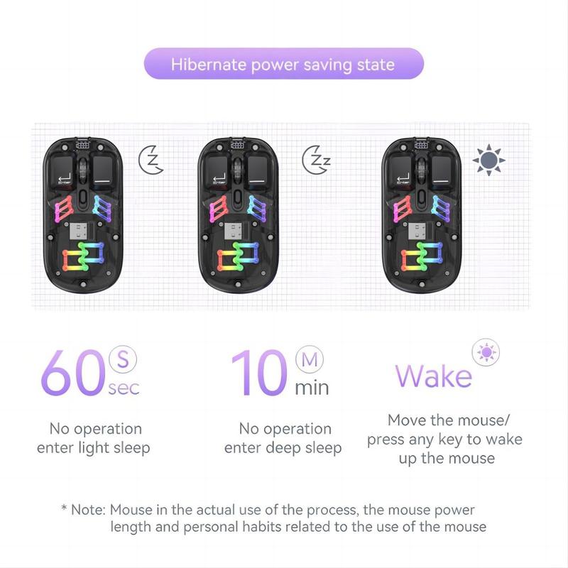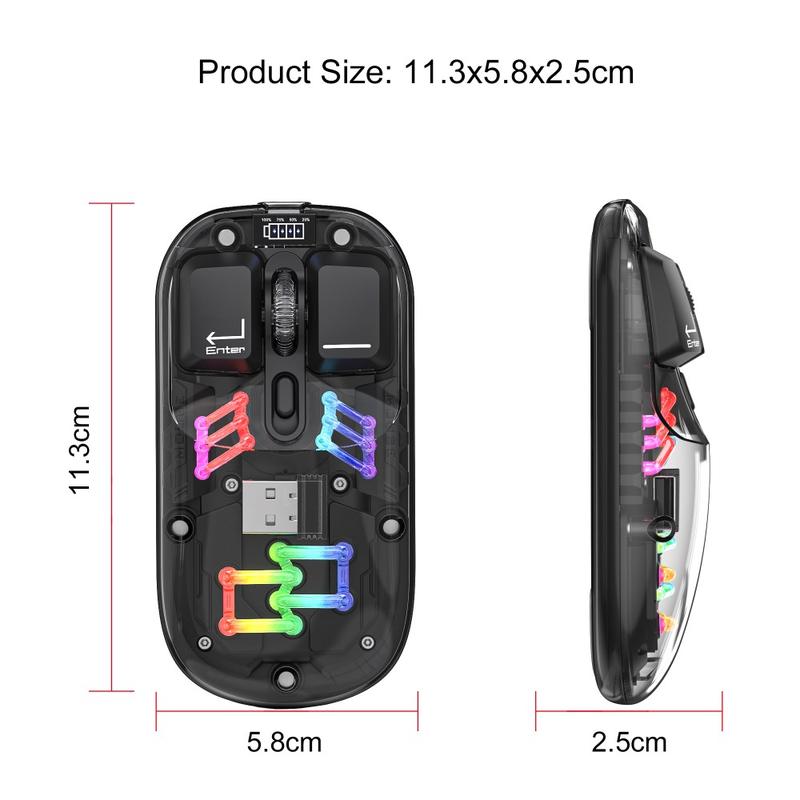 HXSJ T200 Wireless Bluetooth Mouse har dobbel tilkobling via Bluetooth og 2,4 GHz trådløs tilkobling, noe som gir støtte for samtidig tilkobling til to enheter. Denne musen er laget av gjennomsiktig PC-materiale med RGB-belysning som kan tilpasses, og gir et eksklusivt utseende og overlegen funksjonalitet. Med justerbar DPI (800/1200/1600), et oppladbart batteri på 400 mAh med lang levetid og en elegant, ergonomisk design sikrer den presis og smidig bruk. Musen er ideell for både arbeid og spilling, og den forbedrer effektiviteten og komforten med stillegående klikk og levende belysning.