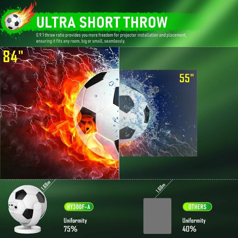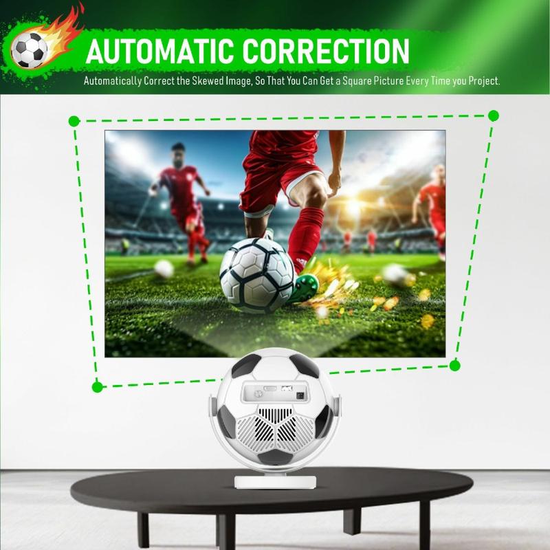 Få stor skjermunderholdning inn i mindre rom med den bærbare projektoren HY300F i fotballform. Denne kompakte, smarte projektoren har et karakteristisk design inspirert av fotball og kombinerer en leken stil med praktiske funksjoner for hjemmeunderholdning. Enten du vil streame filmer, se direktesendt sport, nyte serier eller projisere innhold på veggen eller taket på soverommet, gir denne modellen en enkel og fleksibel måte å skape en mer oppslukende seeropplevelse hjemme.