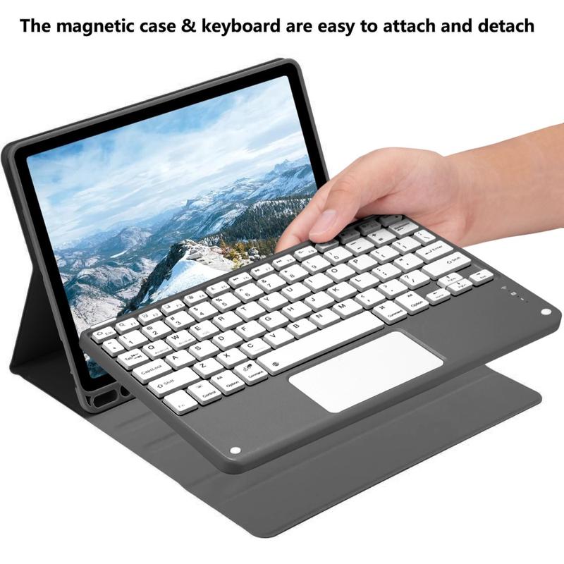 Gjør din iPad Air 11 2026/2025/2024, iPad Air 2022/2020 enda bedre med Bluetooth-tastaturetuiet, et multifunksjonelt 2-i-1-tilbehør som kombinerer beskyttelse, produktivitet og stil. Dette elegante etuiet er laget av førsteklasses polyetan og gir full beskyttelse mot riper, støt og fingeravtrykk, samtidig som det gir et profesjonelt utseende. Bluetooth-tastaturet kobles trådløst til for smidig, responsiv skriving, mens den integrerte styreplaten støtter multigest-kontroll for uanstrengt navigering. Tastaturet har bakgrunnsbelysning, slik at du kan skrive komfortabelt selv i omgivelser med lite lys. Det innebygde justerbare stativet gir en ergonomisk synsvinkel, noe som gjør den perfekt for skriving, strømming eller lesing. Dette tastaturetuiet er designet for forretningsbruk, reiser eller hverdagsbruk, og forvandler nettbrettet ditt til en bærbar arbeidsstasjon.