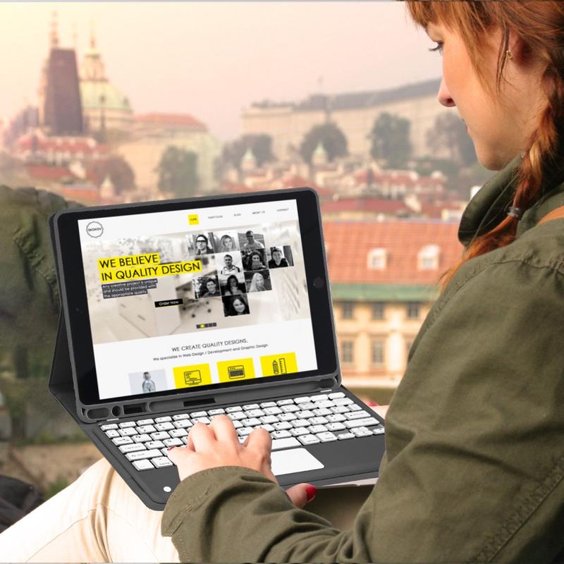 Gjør din iPad Air 11 2026/2025/2024, iPad Air 2022/2020 enda bedre med Bluetooth-tastaturetuiet, et multifunksjonelt 2-i-1-tilbehør som kombinerer beskyttelse, produktivitet og stil. Dette elegante etuiet er laget av førsteklasses polyetan og gir full beskyttelse mot riper, støt og fingeravtrykk, samtidig som det gir et profesjonelt utseende. Bluetooth-tastaturet kobles trådløst til for smidig, responsiv skriving, mens den integrerte styreplaten støtter multigest-kontroll for uanstrengt navigering. Tastaturet har bakgrunnsbelysning, slik at du kan skrive komfortabelt selv i omgivelser med lite lys. Det innebygde justerbare stativet gir en ergonomisk synsvinkel, noe som gjør den perfekt for skriving, strømming eller lesing. Dette tastaturetuiet er designet for forretningsbruk, reiser eller hverdagsbruk, og forvandler nettbrettet ditt til en bærbar arbeidsstasjon.