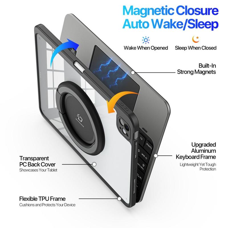 Etuiet er designet med magnetisk feste og støtter automatisk vekking og dvalefunksjoner for å spare batterilevetid. Bare åpne for å aktivere iPad-en og lukk for å sette den i standby.