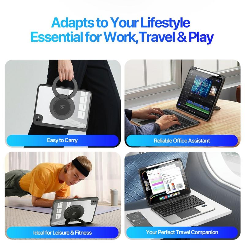 Få ubegrensede posisjoneringsmuligheter med det 360° roterende stativet og 180° vinkeljustering, med støtte for både liggende og stående stilling. Perfekt for skriving, videosamtaler, tegning eller for å se på favorittseriene dine.