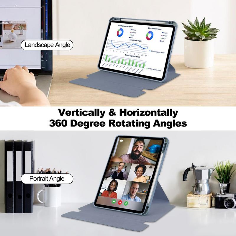 Roterende nettbrettvesker ble stadig mer populære etter hvert som skjermene ble større og mer uunnværlige i hverdagen. Den 360° dreibare vinkelen gir ergonomiske fordeler og hjelper deg med å oppnå den ideelle vinkelen for visning og skriving. I tillegg minimerer denne designen belastningen på nakken ved at du kan plassere skjermen i den høyden og retningen som er mest behagelig for deg, noe som forbedrer den generelle opplevelsen av nettbrettet.