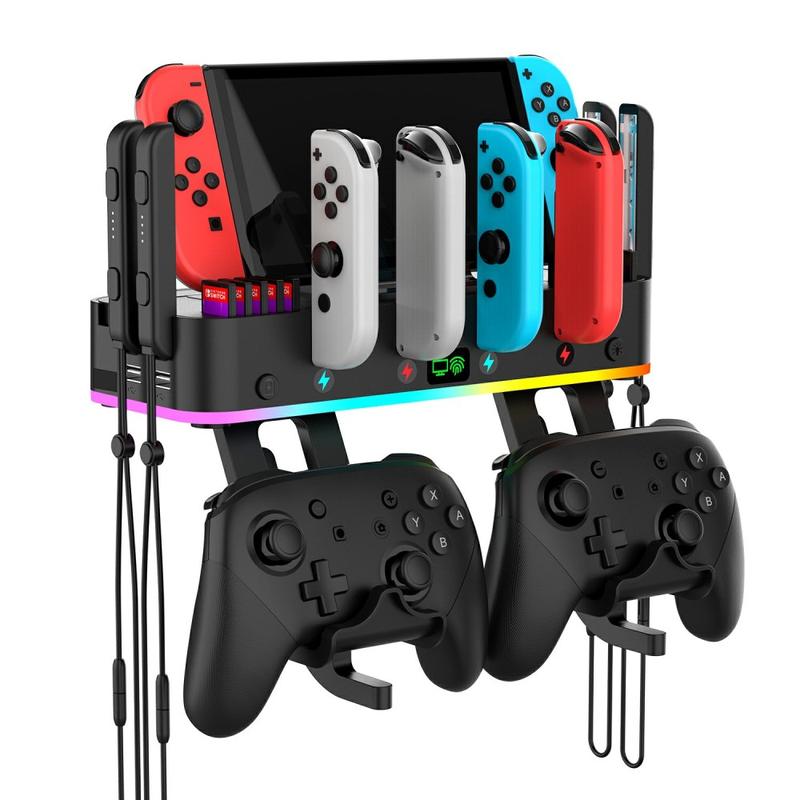 Med ti lagringsplasser for spillkort, to lagringsplasser for Joy-Con-kontrollere og to lagringsstativer for Pro-kontrollere er det enkelt å oppbevare og få tilgang til NS-verts eksterne produkter.
