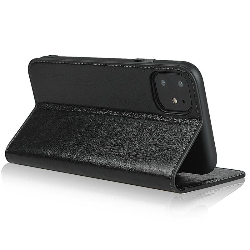 Et sofistikert skinndeksel av høy kvalitet til din iPhone 11. Gi telefonen et førsteklasses utseende, samtidig som du holder den trygg mot riper og vanlige skader. Denne multifunksjonelle lommeboken i mykt skinn har innerlommer for kort og en større lomme for kontanter. På toppen av det iPhone 11 ekte skinndeksel har handsfree stativ og frontutskjæring for å snakke med dekselet lukket.