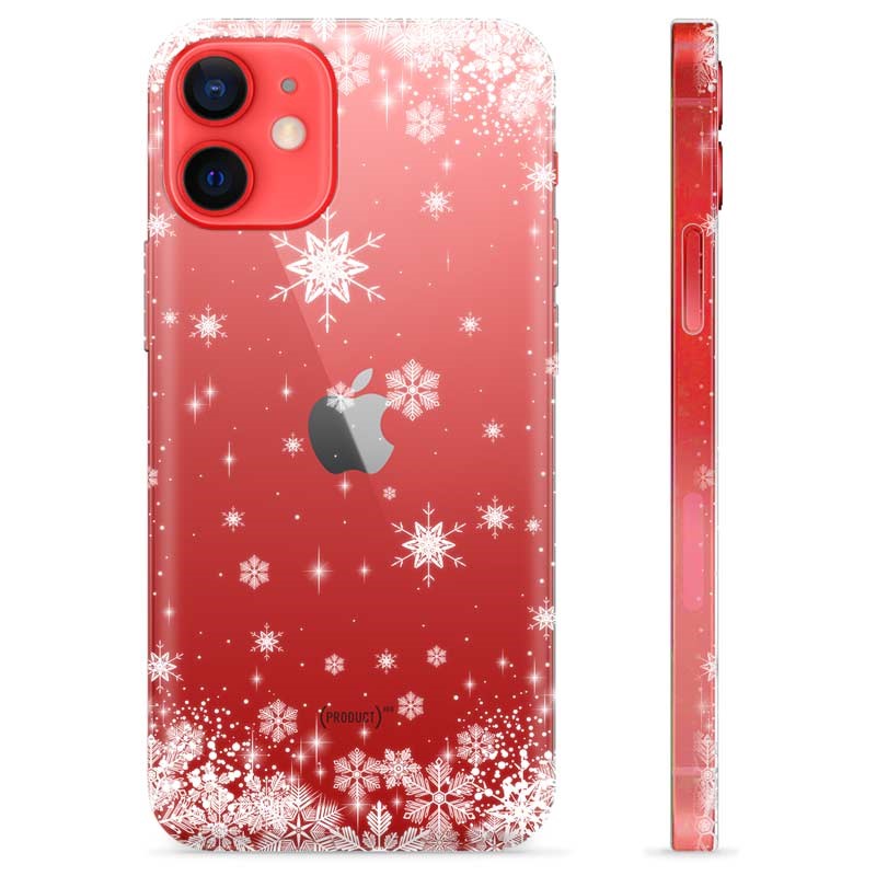 Dette er et TPU-deksel for iPhone 12 mini, designet for å tilby beskyttelse og stil til din smarttelefon. Dekselet er gjennomsiktig med et sjarmerende snøfnuggmønster som gir en festlig og vinterlig følelse. Det ser ut til å ha en rød bakgrunn som fremhever snøfnuggene og gir dekselet et fargerikt utseende.