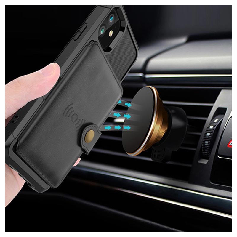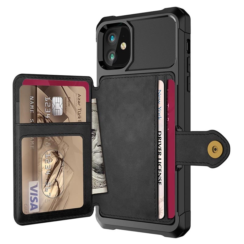- Lommeboketuiet til iPhone 12 Mini har en sikker trykknapplukking, lommebokdesign, flere kortspor og en kontantlomme.