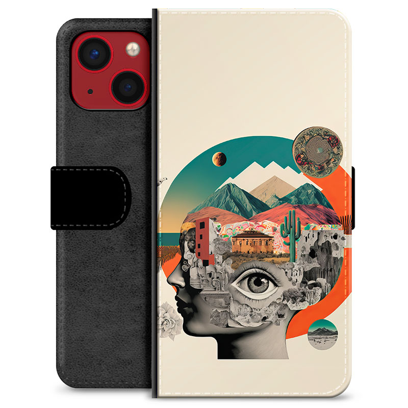 Dette iPhone 13 Mini premium lommebok-dekselet med et abstrakt collage-design er det perfekte tilbehøret for den stilbevisste smartphone-brukeren. Dekselet er ikke bare et blikkfang med sitt unike trykk som kombinerer geometriske former, arkitektoniske elementer og naturlige landskap i et surrealistisk mønster, men det er også svært funksjonelt.