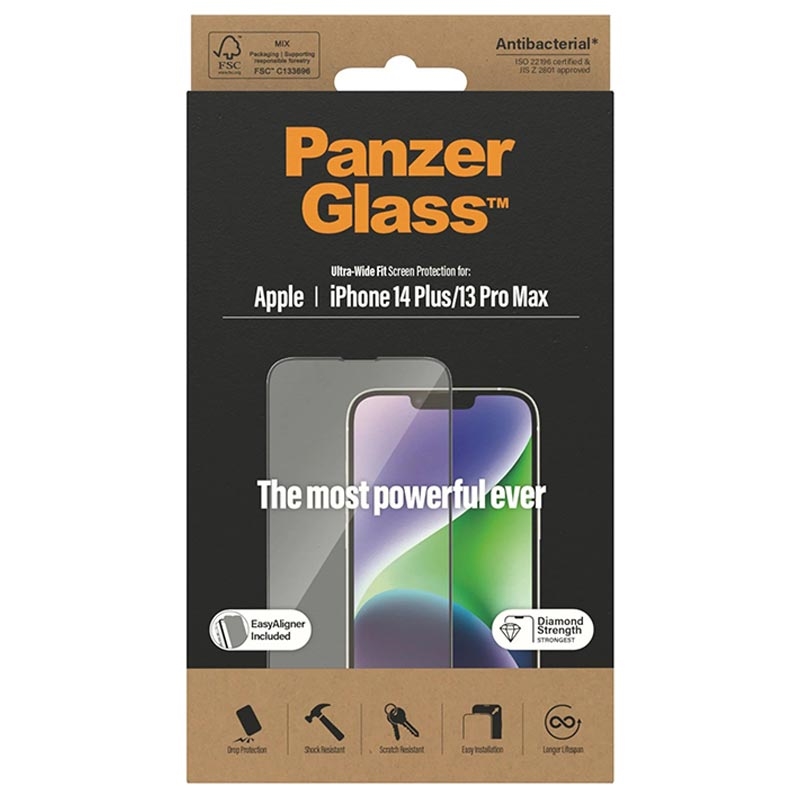 PanzerGlass Ultra-Wide Fit EasyAligner AntiBacterial Skjermbeskytter i Herdet Glass til iPhone 13 Pro Max, iPhone 14 Plus