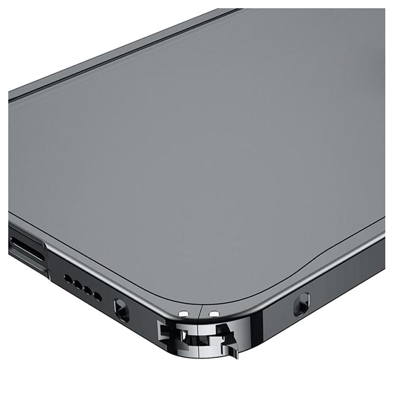Forsterk iPhone 13 Pro Max med dette ultimate dekselet laget som en kombinasjon av en metall støtfanger og plastbaksiden av telefonen.