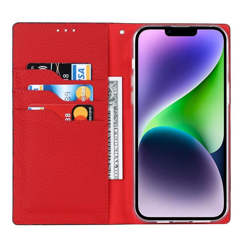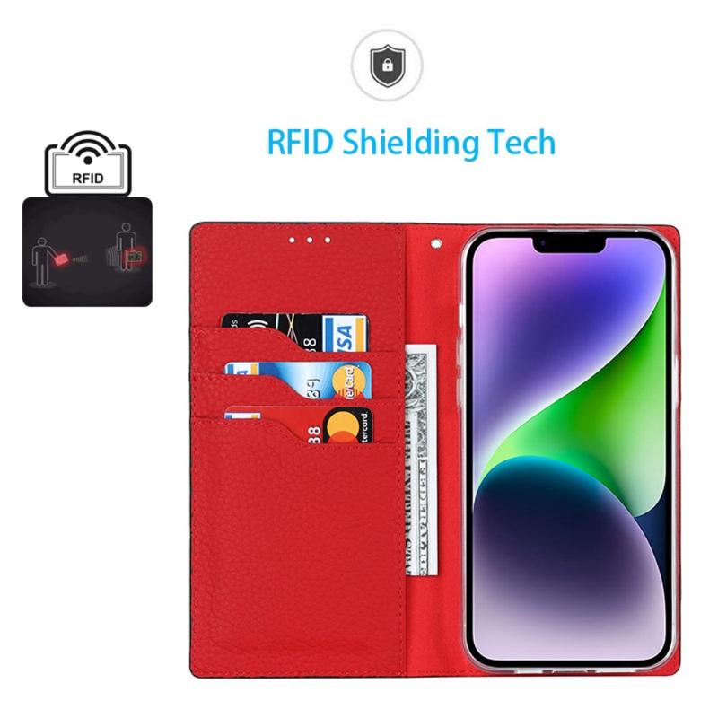 For iPhone 14 RFID-blokkeringskortspor Lommebok Deksel Litchi Tekstur Stativ i ekte skinn Autoabsorbert beskyttelsesdeksel
