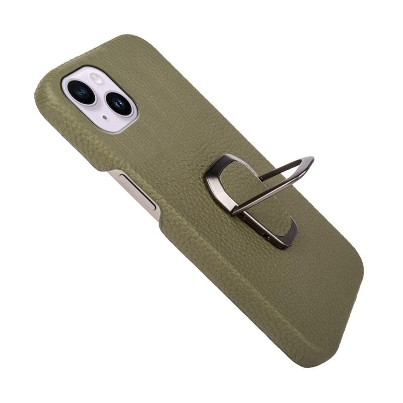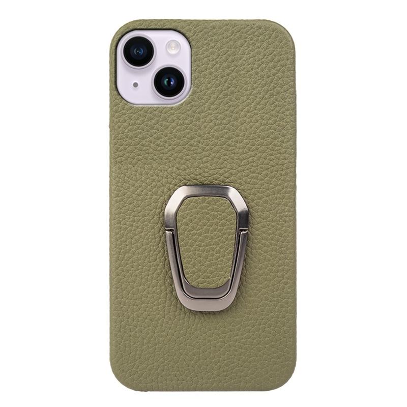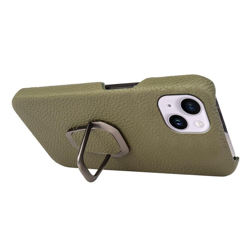 For iPhone 14 Plus ekte skinnbelagt PC-beskyttende telefondeksel Ringholder Kickstand Design Litchi Texture Sklisikkert støtsikkert deksel