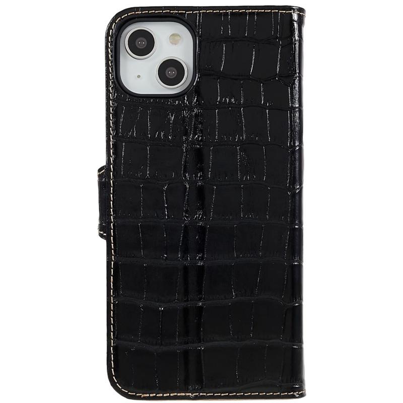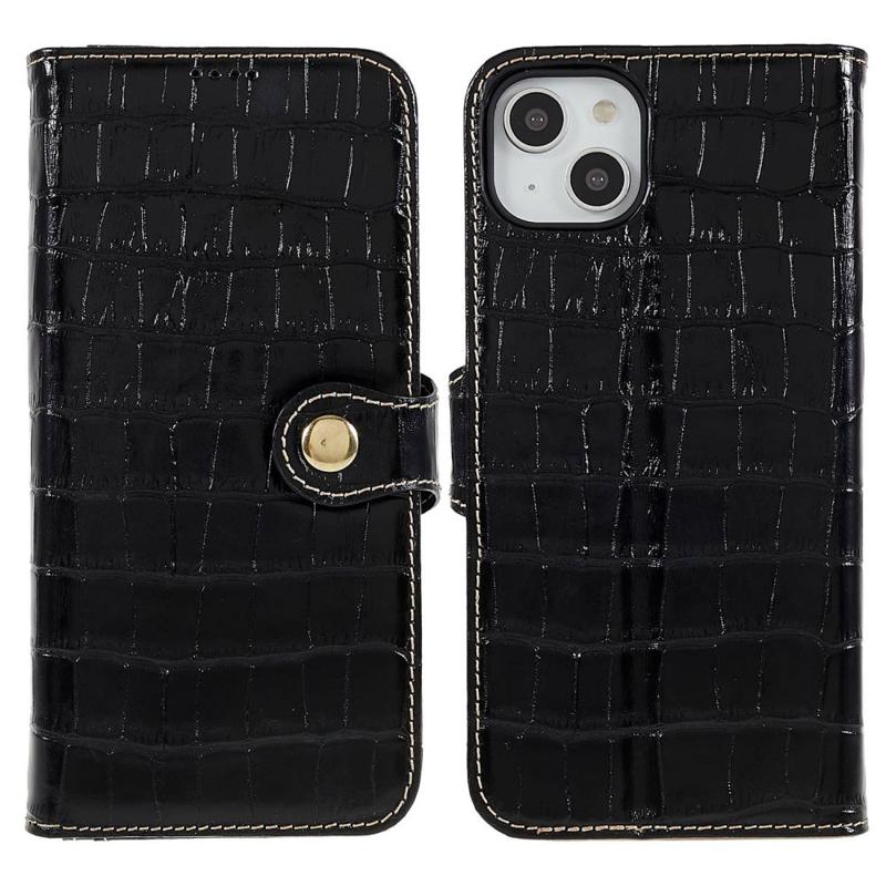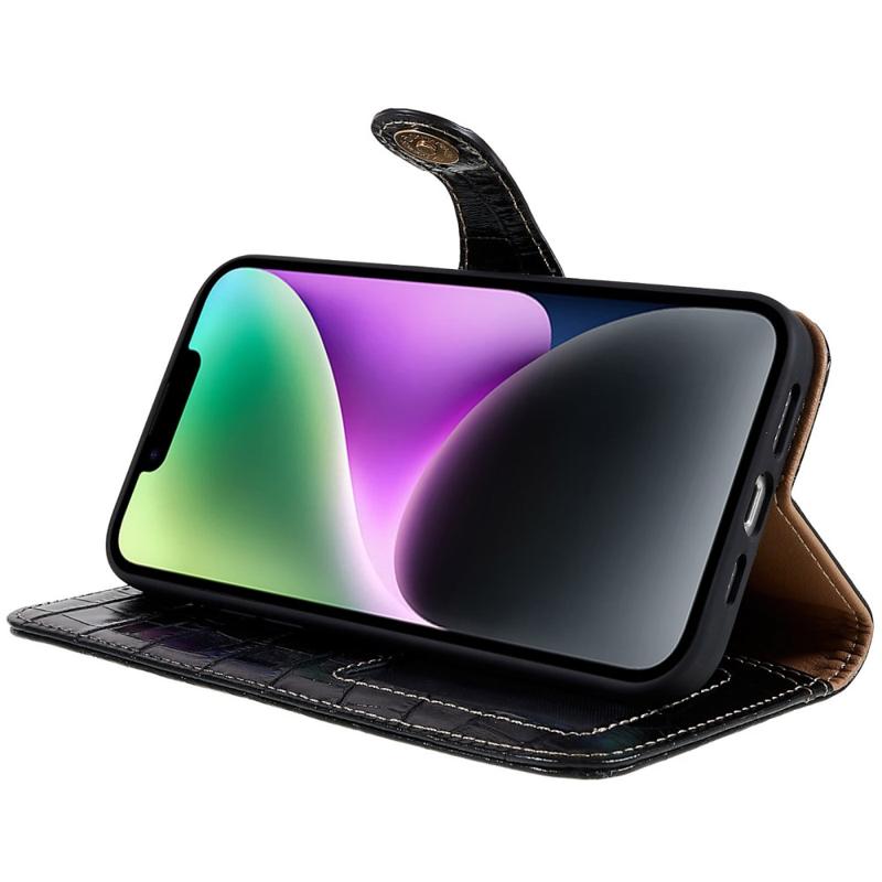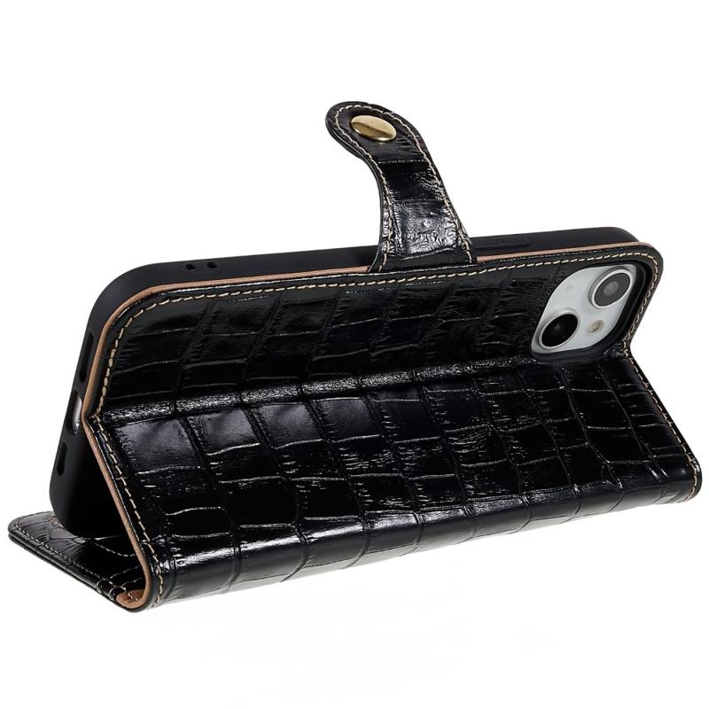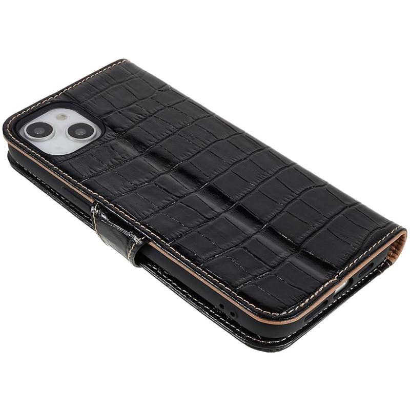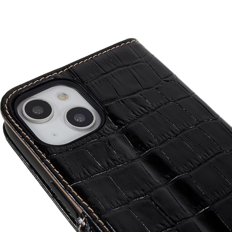 For iPhone 14 Plus ekte okseskinn Anti-slipp telefonveske Crocodile Texture Stand Full Protection Flip Wallet Cover