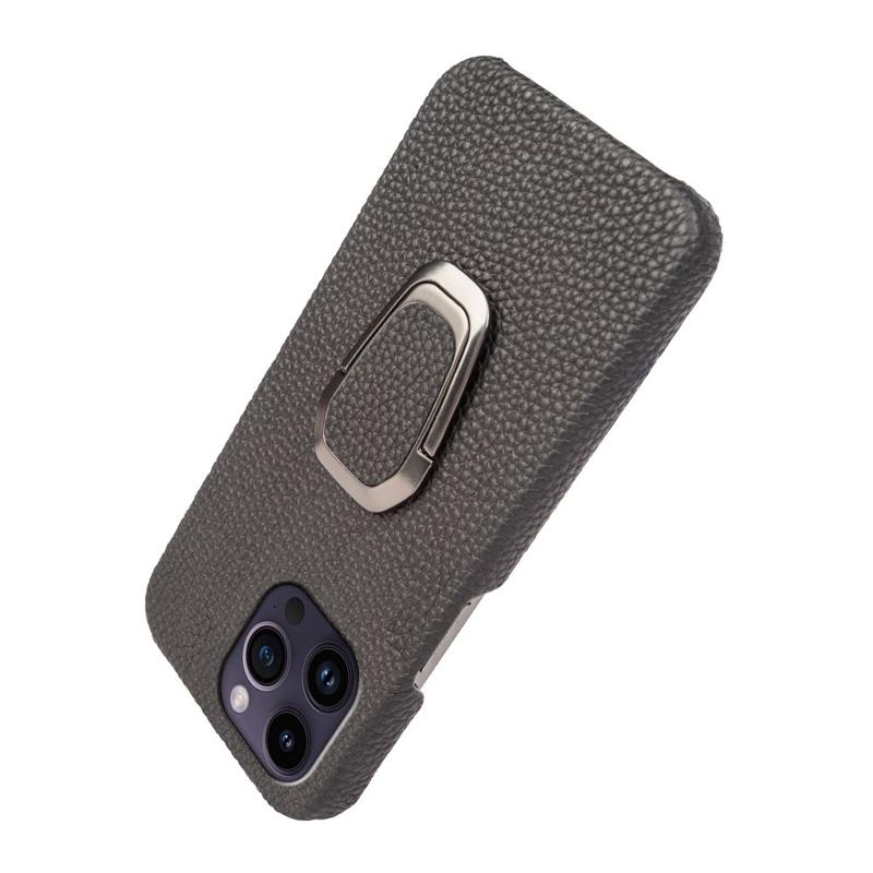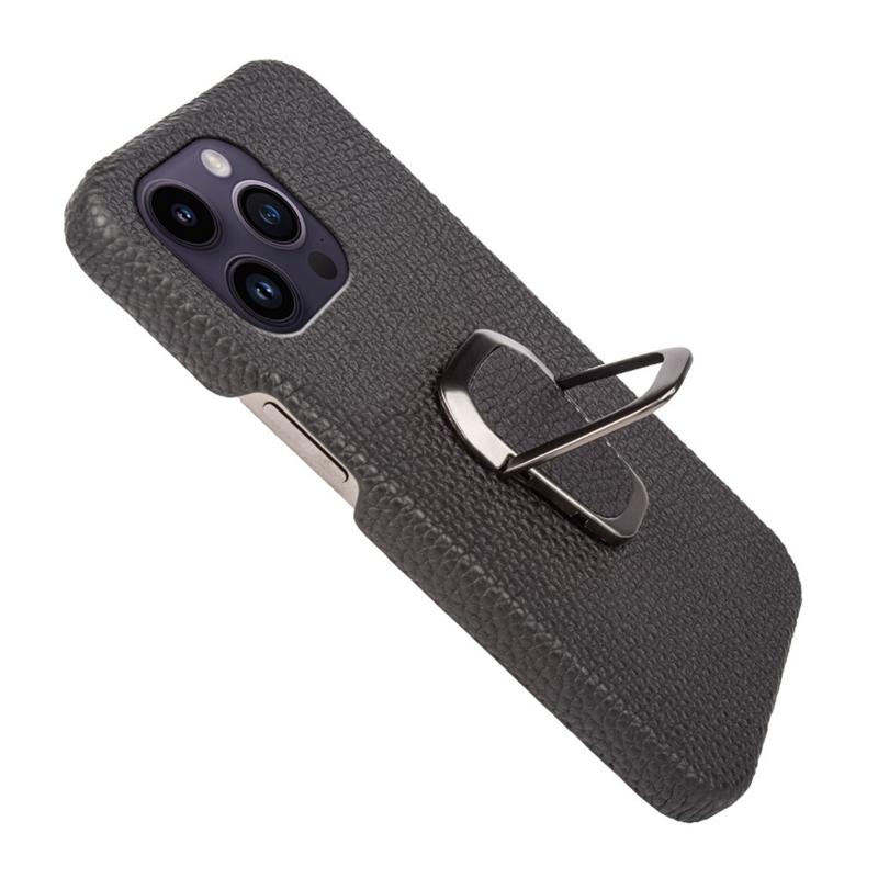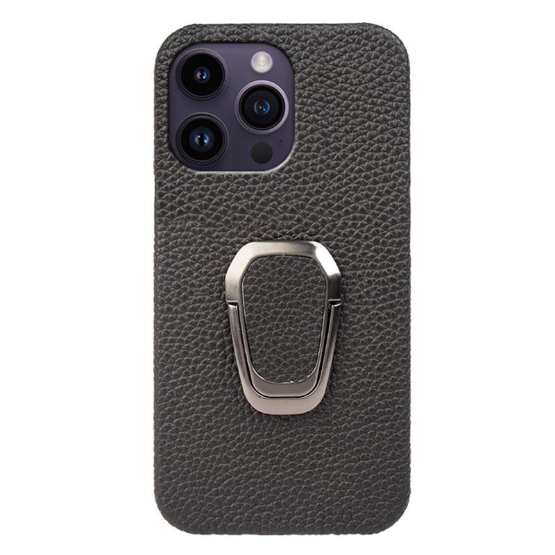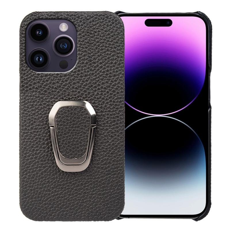 For iPhone 14 Pro Max ekte skinn + hardt PC-beskyttende skall Litchi Texture Ring Stativ Anti-Drop telefondeksel