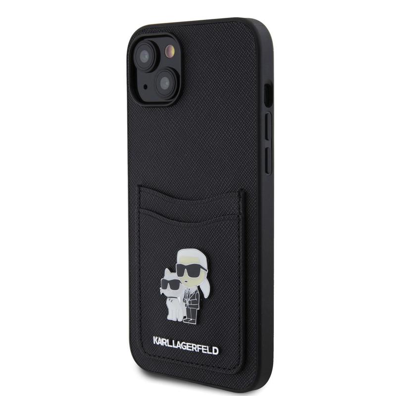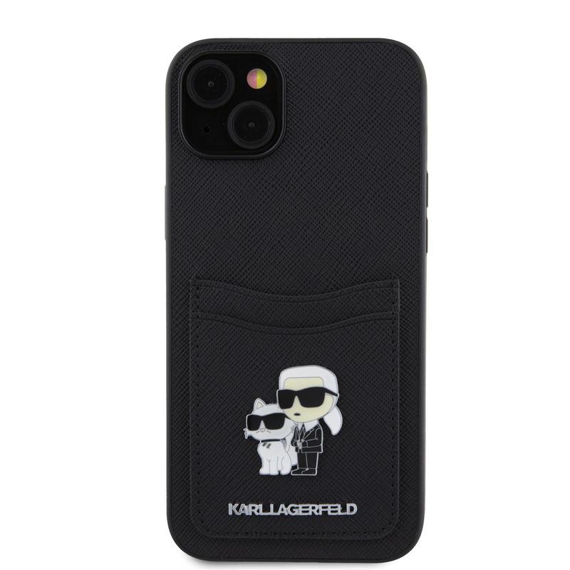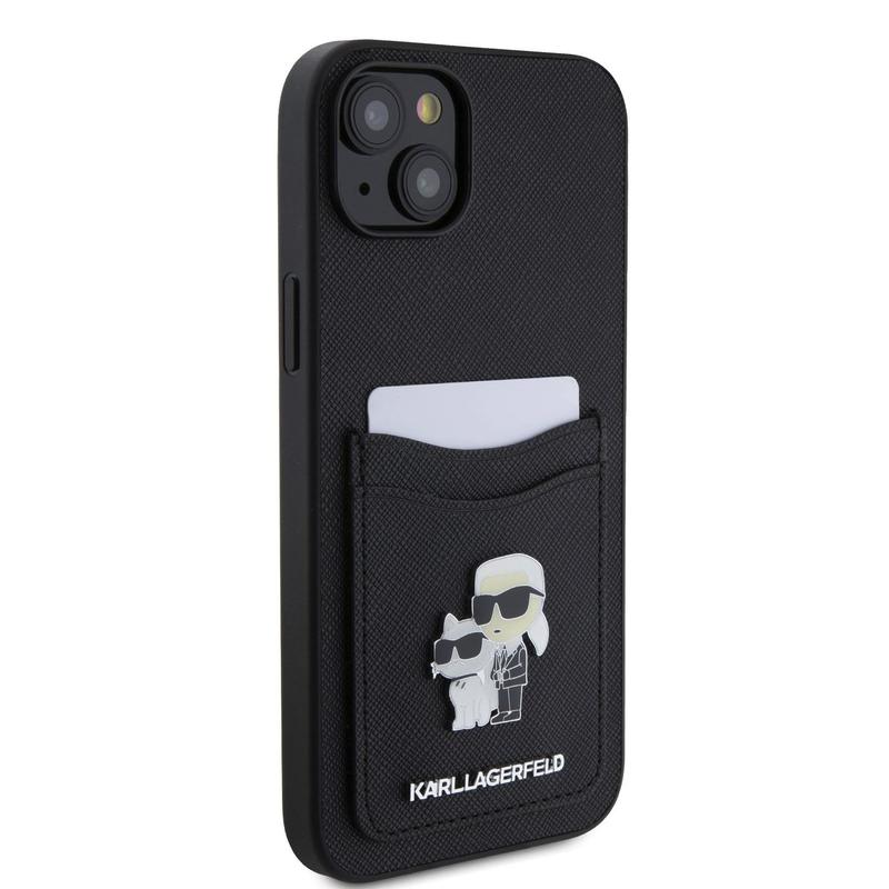 Med iPhone 15 Karl Lagerfeld Saffiano etui med kortlomme i metall Karl & Choupette - sort får du ikke bare et beskyttende deksel, men også et stykke motehistorie som vil gjøre din iPhone 15 til et stilfullt og funksjonelt tilbehør.