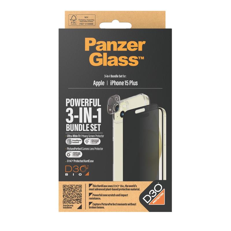 PanzerGlass Privacy 3-i-1-pakke for iPhone 15 Plus - HardCase-deksel, PicturePerfect kameralinsebeskyttelse, Ultra-Wide Fit skjermbeskytter
