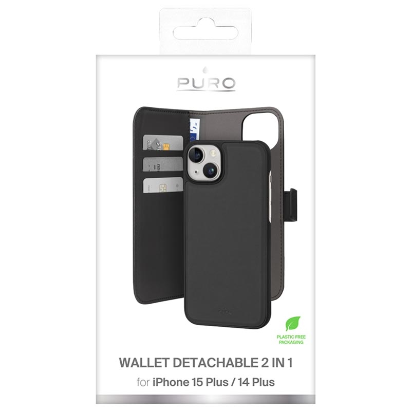 Med iPhone 15 Plus Puro 2-i-1 Magnetisk Pung Taske - Sort får du en elegant, funksjonell og beskyttende løsning som oppfyller dine behov for både telefonbeskyttelse og praktisk oppbevaring.