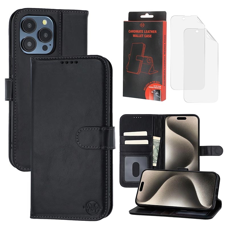 MyTPhone CardMate Premium lommebokveske i lær for iPhone 15 Pro - stativfunksjon, kortholder, støtte for trådløs lading, 2x skjermbeskytter