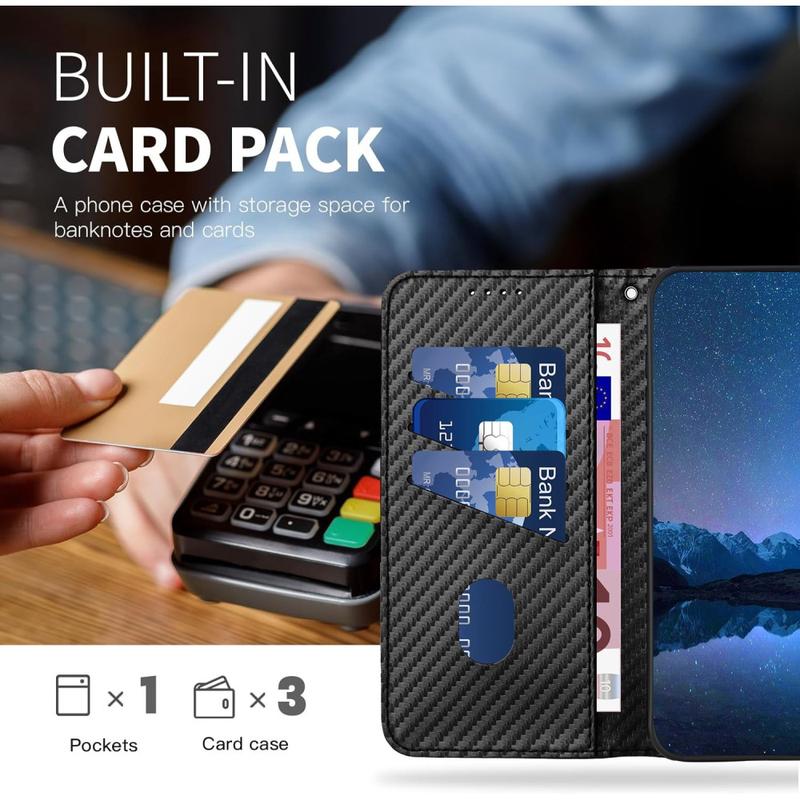Beskytt din iPhone 15 Pro Max med stil med dette førsteklasses lommeboketuiet, designet med en førsteklasses karbonfibertekstur som gir et elegant og moderne utseende. Det kombinerer funksjonalitet, komfort og pålitelig beskyttelse, og er den perfekte daglige følgesvenn for brukere som setter pris på både praktisk og elegant design.
