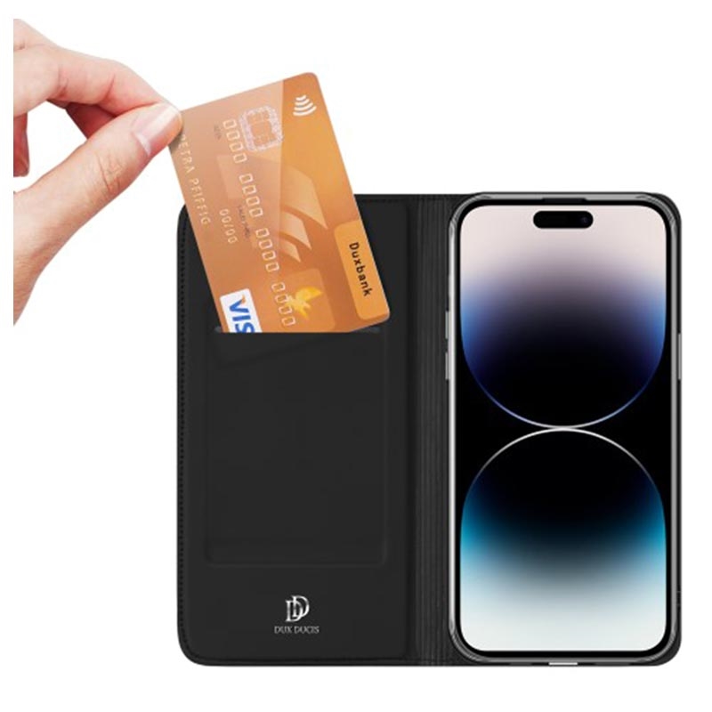Med et kortspor for lagring av ID eller kredittkort. Dux Ducis Skin Pro flip-deksel til iPhone 15 Pro har også et stativ for håndfri medievisning.