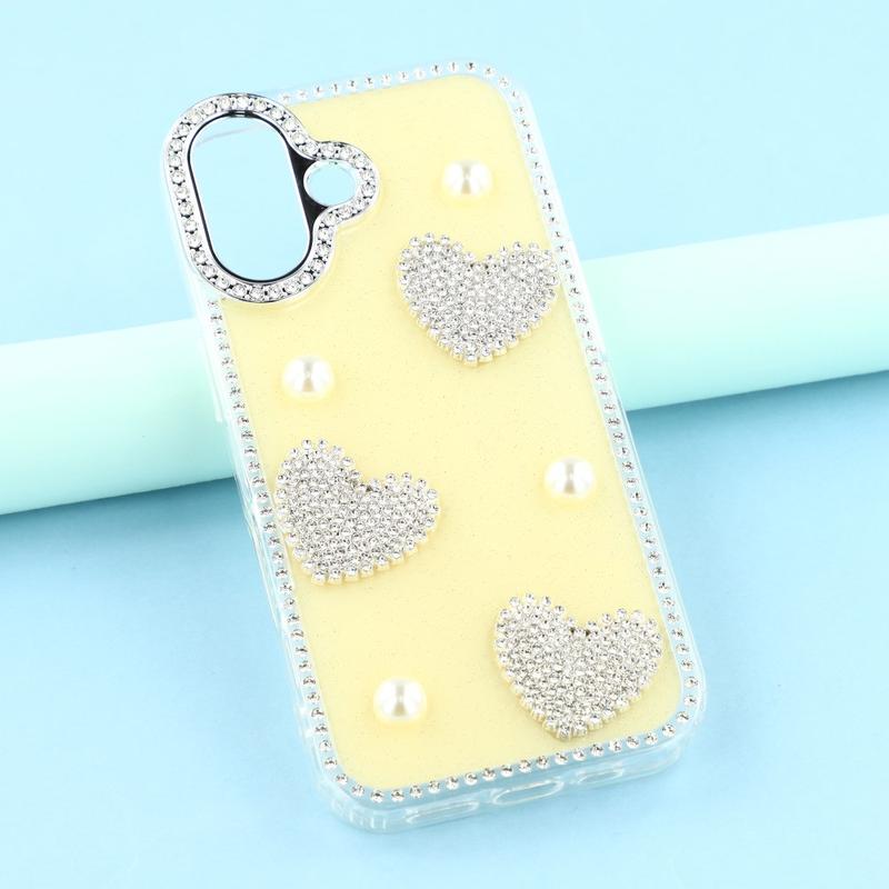 Dette iPhone 16-etuiet kombinerer pålitelig hverdagsbeskyttelse med glamorøs stil. Med glitrende rhinestones rundt kantene og glitrende perlehjertedekorasjoner på baksiden forvandler det din iPhone 16 til et moteriktig tilbehør, samtidig som det beskytter den mot riper og støt.