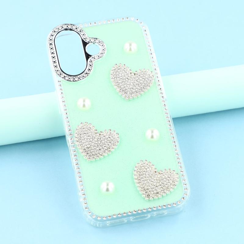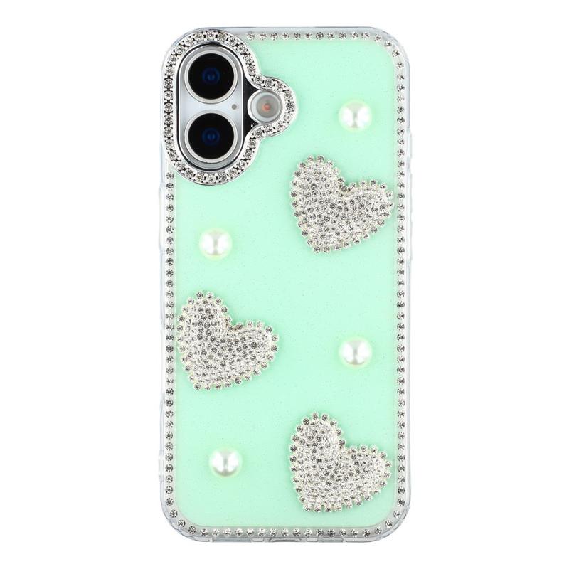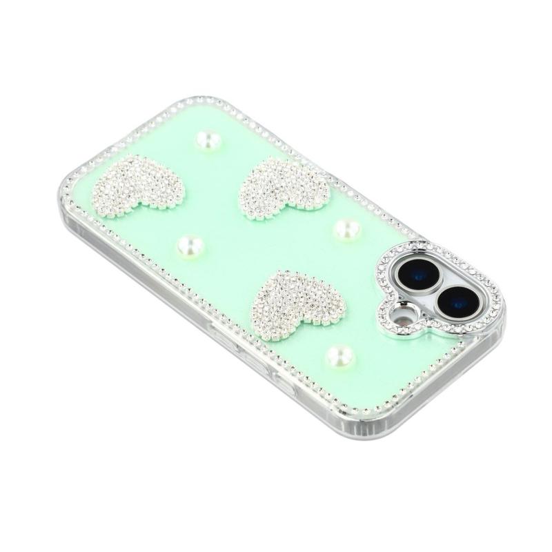 Dette iPhone 16-etuiet kombinerer pålitelig hverdagsbeskyttelse med glamorøs stil. Med glitrende rhinestones rundt kantene og glitrende perlehjertedekorasjoner på baksiden forvandler det din iPhone 16 til et moteriktig tilbehør, samtidig som det beskytter den mot riper og støt.