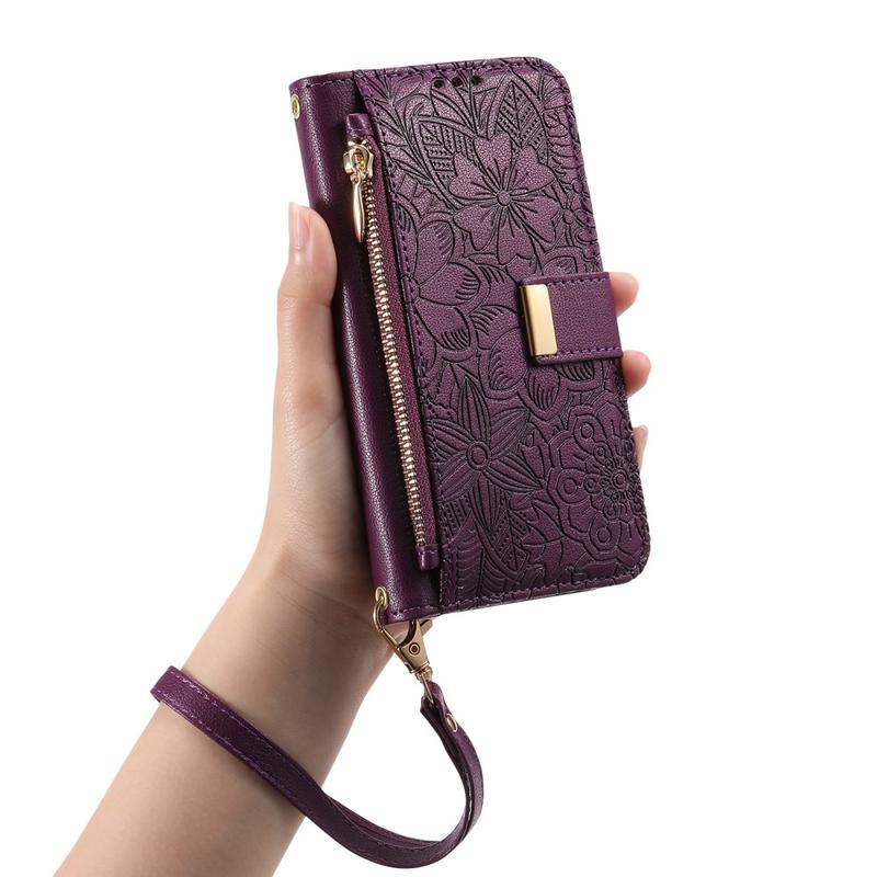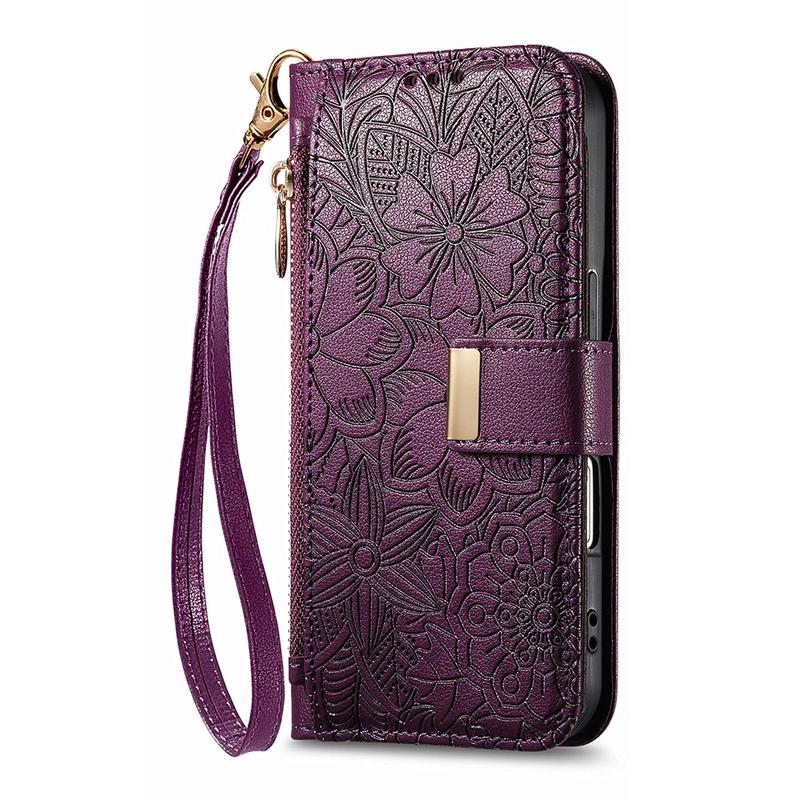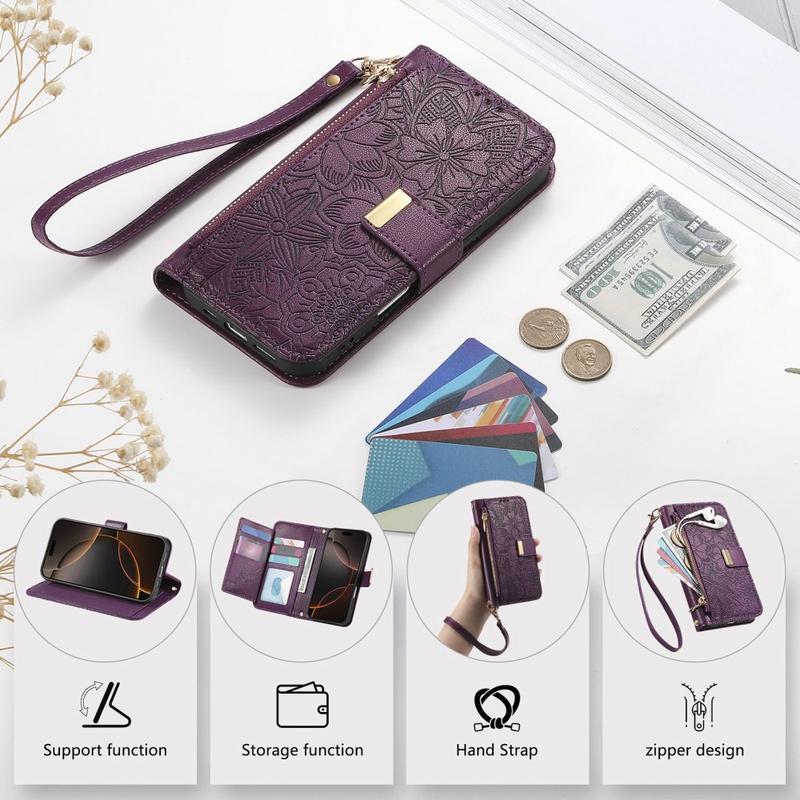 Lommebokveske med blomster- og bladmønster, glidelåslomme og håndleddsstropp til iPhone 16