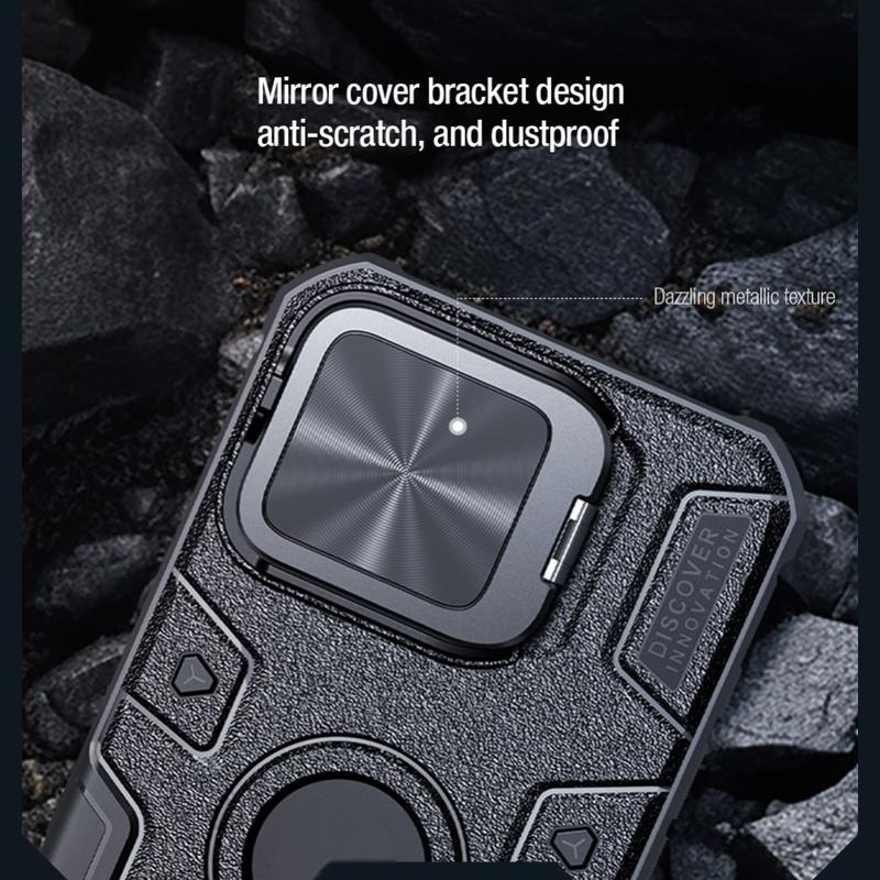 Nillkin CamShield Armor Prop Case for iPhone 16 Pro Max gir overlegen beskyttelse med sin robuste PC- og TPU-konstruksjon. Det har et skyvbart deksel til kameralinsen for å beskytte kameraet mot riper og støv. Dette etuiet er også MagSafe-kompatibelt, slik at du kan lade trådløst og feste MagSafe-tilbehør. Med det solide støttebenet kan du se på kameraet med hendene frie. Den elegante designen gir din iPhone 16 Pro Max et stilig, men funksjonelt preg.