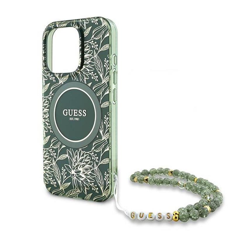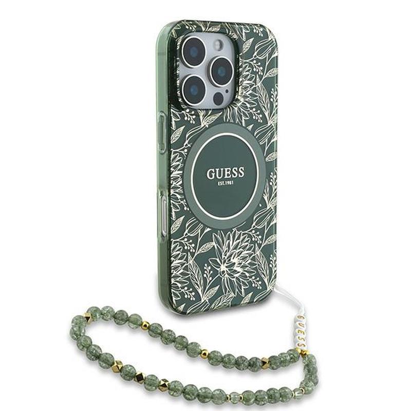 Guess IML Flowers Allover Electro-deksel med perlearmbånd for iPhone 16 Pro - MagSafe-kompatibel
