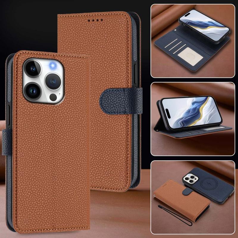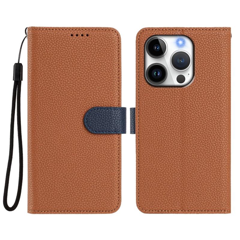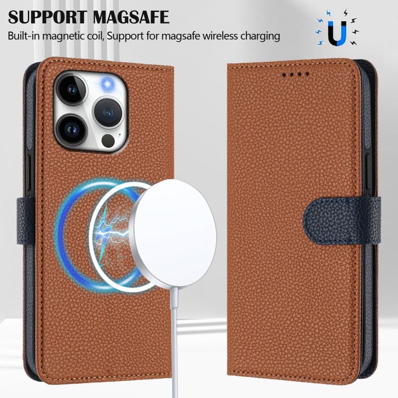 iPhone 16 Pro avtakbar lommebokveske med MagSafe, RFID-beskyttelse og håndrem - brun / blå