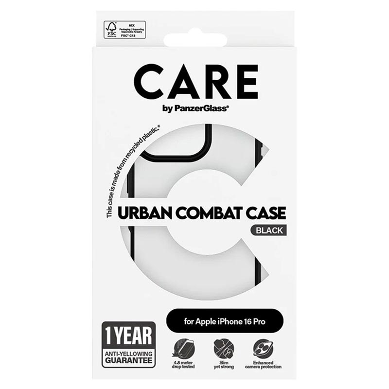 CARE by PanzerGlass Flagship Case for iPhone 16 Pro Urban Combat med klar ramme er designet for deg som trenger robust beskyttelse uten å ofre stilen. Dette etuiet er laget av 100 % resirkulert plast, tåler fall fra opptil 4,8 meters høyde og har forbedret motstand mot riper og støt. Det er også kompatibelt med trådløs lading og leveres med 1 års anti-gulningsgaranti.