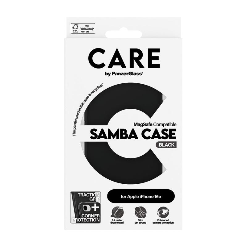 Beskytt din iPhone 16e med stil, bærekraft og komfort med CARE by PanzerGlass Fashionable Case i Samba Black - der teknisk beskyttelse møter moderne design!