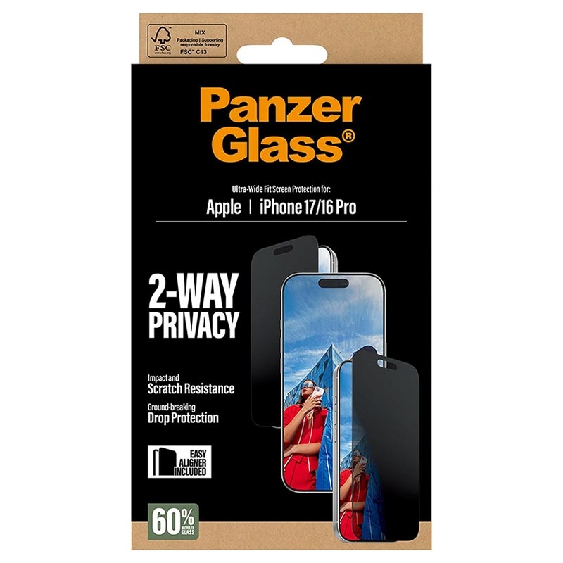 PanzerGlass Ultra-Wide Fit EasyAligner 2-Way Privatliv Skjermbeskytter i Herdet Glass for iPhone 17, iPhone 16 Pro