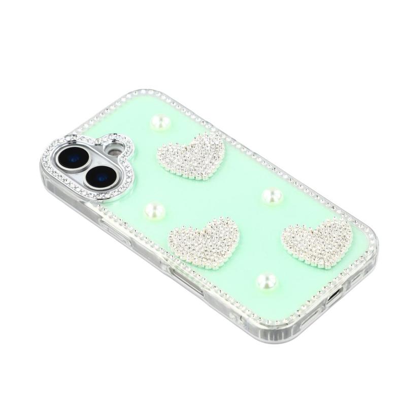 Dette iPhone 17-etuiet kombinerer pålitelig hverdagsbeskyttelse med glamorøs stil. Med glitrende rhinestones rundt kantene og glitrende perlehjertedekorasjoner på baksiden forvandler det din iPhone 17 til et moteriktig tilbehør, samtidig som det beskytter den mot riper og støt.