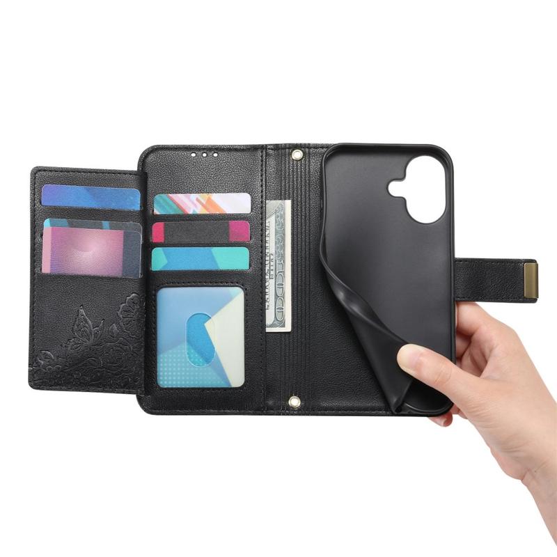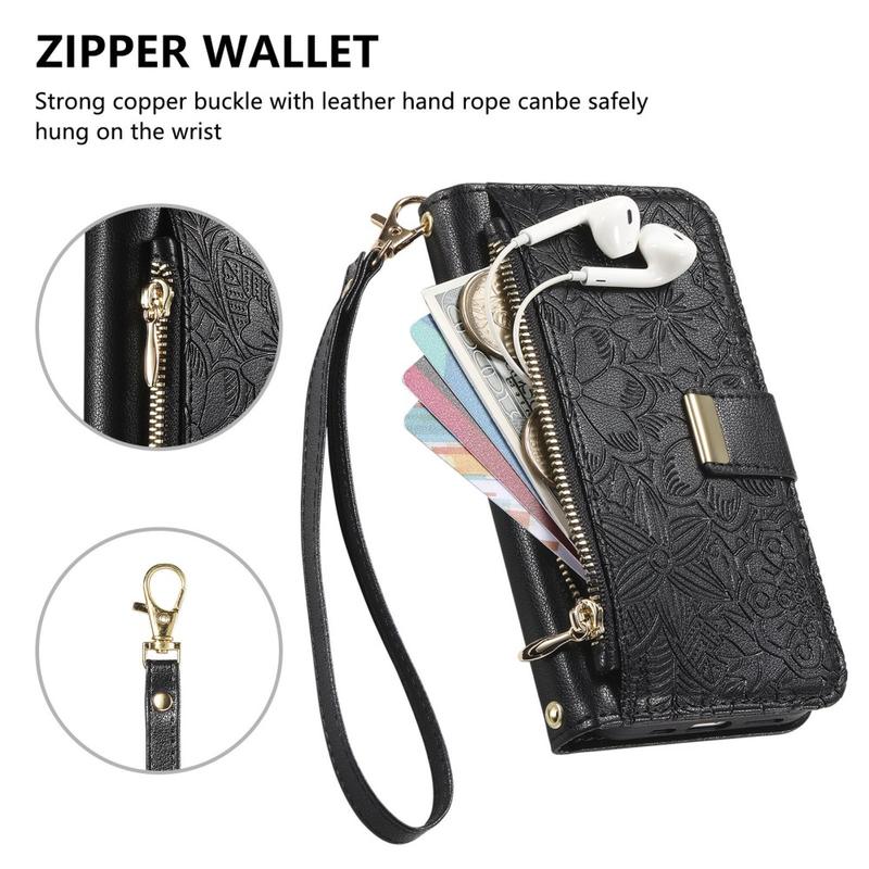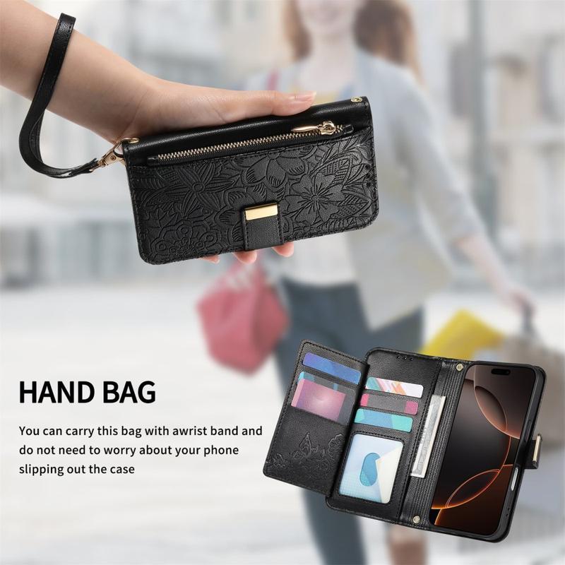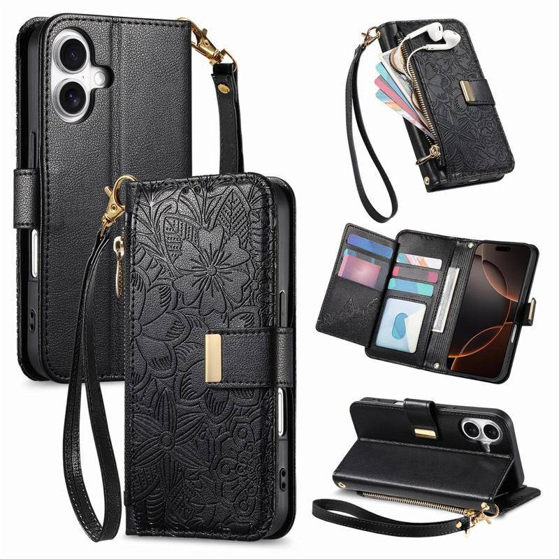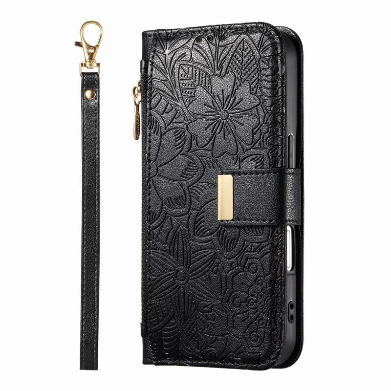 iPhone 17 lommebokveske med blomster- og bladmønster, glidelåslomme og håndleddsstropp - svart