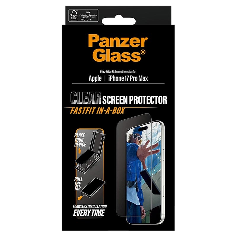 PanzerGlass Ultra-Wide Fit skjermbeskytter for iPhone 17 Pro Max er designet for rask, boblefri installasjon takket være det innovative FASTFIT IN-A-BOX-systemet. Bare plasser iPhone 17 Pro Max med forsiden opp, trekk i tappen, og nyt en perfekt justert beskyttelse hver gang - uten støv, uten frustrasjon.