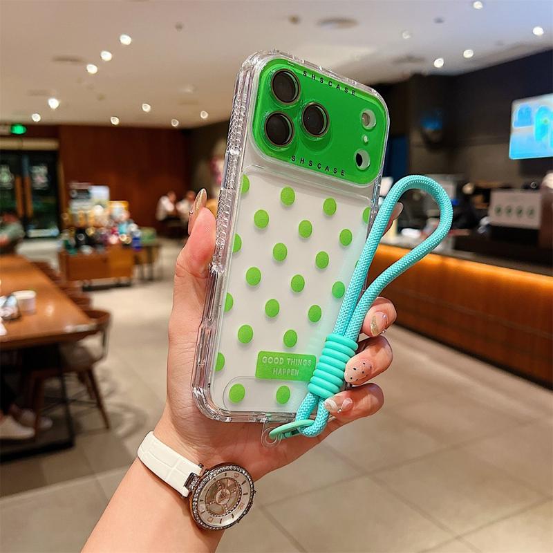 Gi din iPhone 17 Pro Max både sjarm og beskyttelse med dette Polka Dot Hybrid-dekselet. Det er laget av en blanding av TPU og PC, og gir holdbarhet, fleksibilitet og daglig beskyttelse mot riper og fall. Den gjennomsiktige baksiden har et lekent polkaprikkmønster og inkluderer en linsefilm av herdet glass for å beskytte kameraet ditt. Med en matchende håndleddsstropp og motivasjonsfrasen "GOOD THINGS HAPPEN" kombinerer dette etuiet stil, positivitet og funksjonalitet i ett.