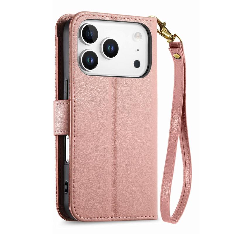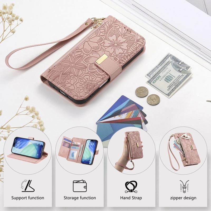 Lommebokveske med blomster- og bladmønster, glidelåslomme og håndleddsstropp til iPhone 17 Pro
