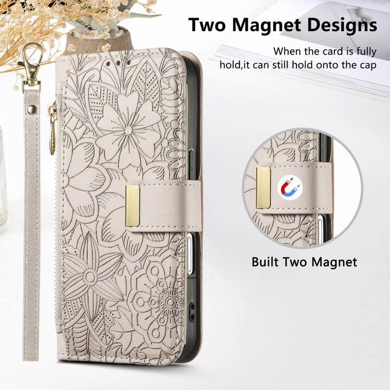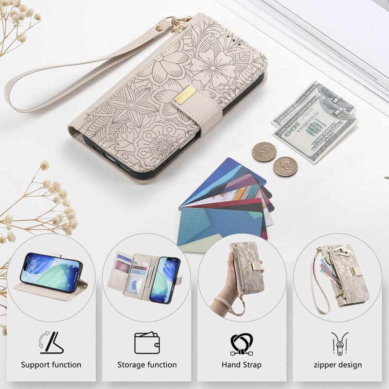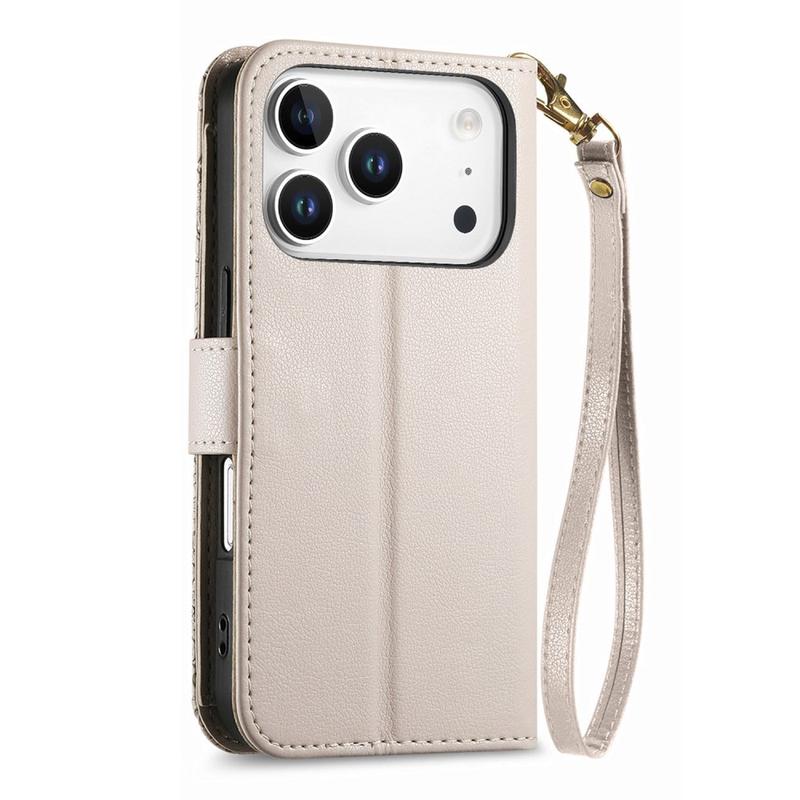 Lommebokveske med blomster- og bladmønster, glidelåslomme og håndleddsstropp til iPhone 17 Pro