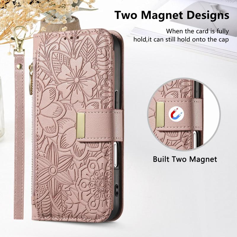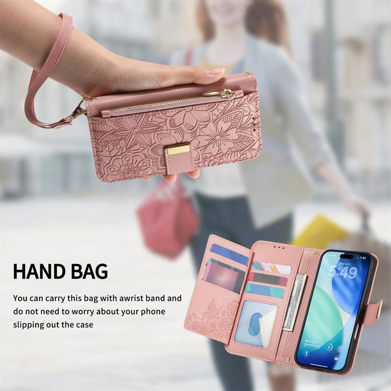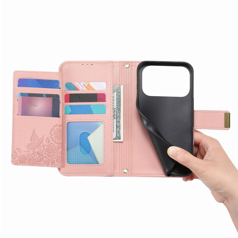 Lommebokveske med blomster- og bladmønster, glidelåslomme og håndleddsstropp til iPhone 17 Pro Max