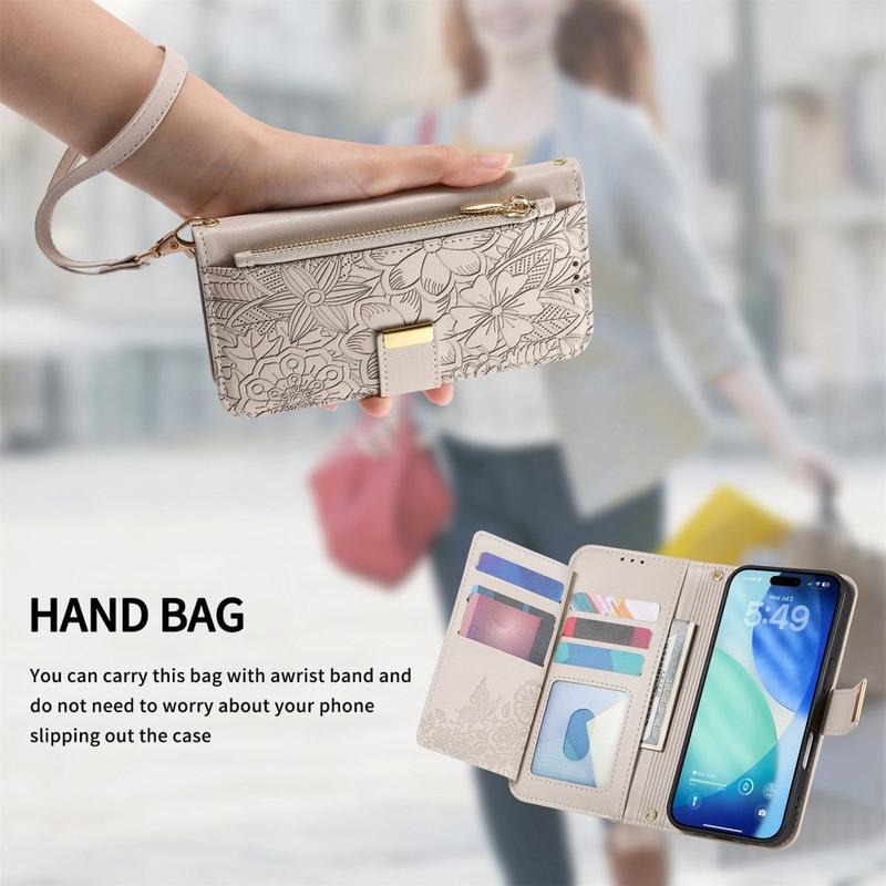 Lommebokveske med blomster- og bladmønster, glidelåslomme og håndleddsstropp til iPhone 17 Pro Max