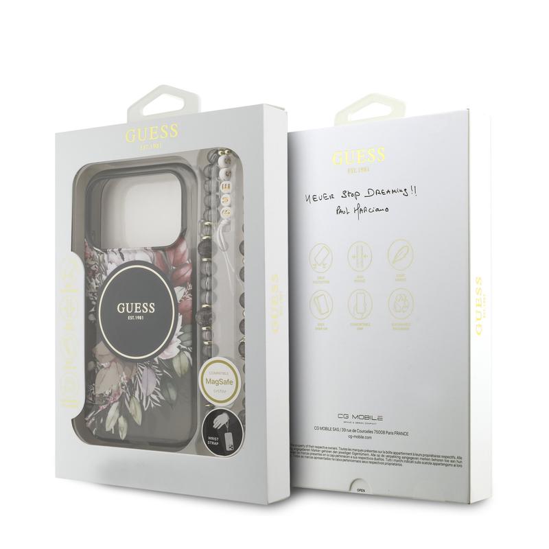 Guess IML Flowers-deksel med perlerem til iPhone 17 Pro - MagSafe-kompatibelt, elegant beskyttelsesetui med perlebelagt håndleddsrem