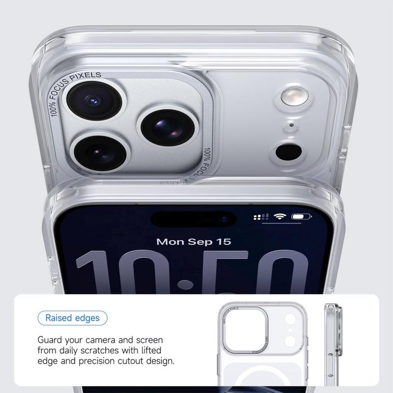 En 0,5 mm forhøyet ramme omgir kameramodulen, kombinert med en beskyttende metallramme som forbedrer støtmotstanden og forhindrer riper - uten å forstyrre bildets klarhet.