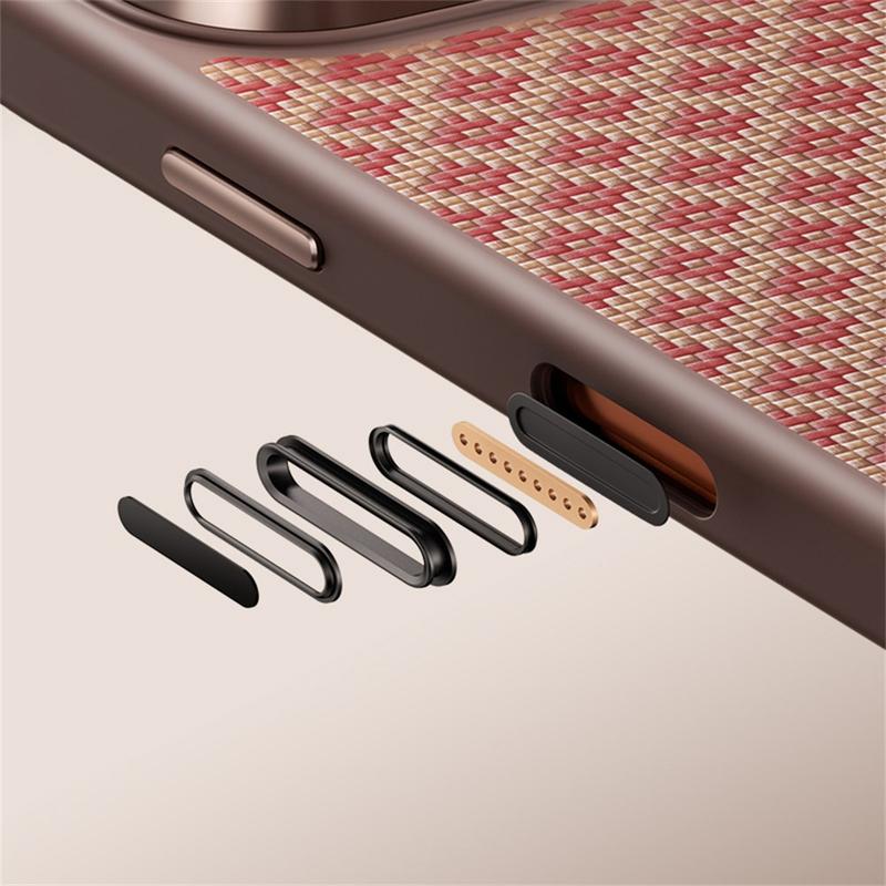 Den kunstneriske, geometrisk vevde bakplaten i aramidfiber gir en unik taktil følelse og et sofistikert, høyteknologisk utseende. Den strukturerte overflaten gir bedre grep og fremhever materialets førsteklasses karakter, noe som gjør at etuiet skiller seg ut samtidig som det har en minimalistisk design.