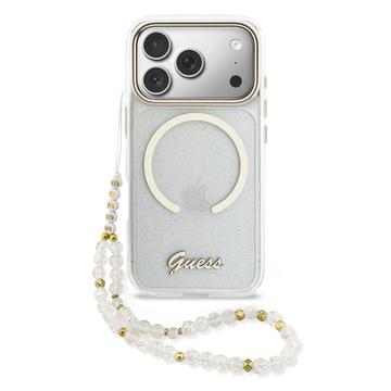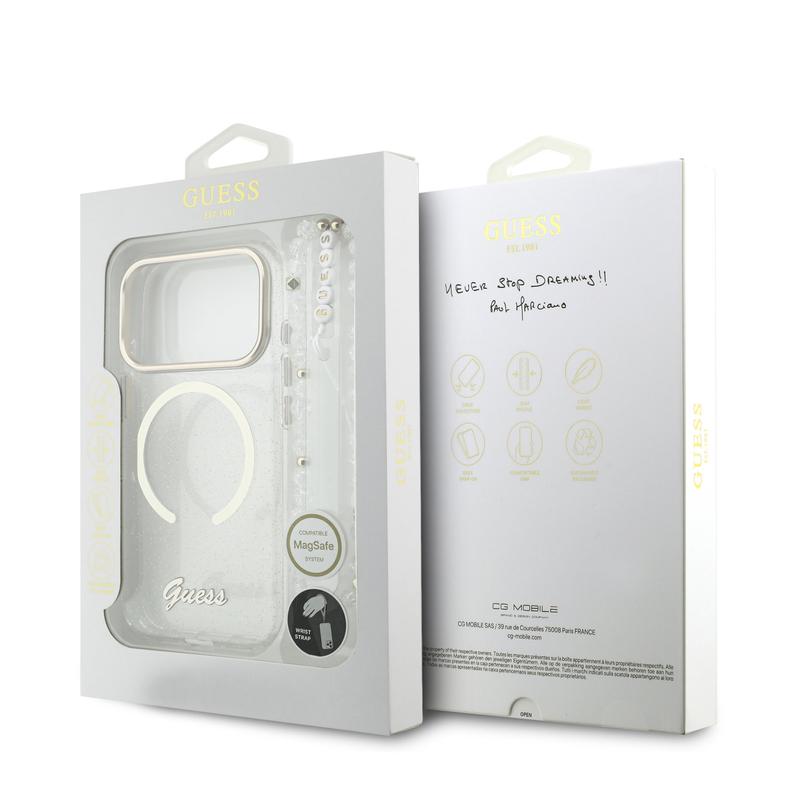 Guess IML Glitter Script Rem MagSafe-deksel til iPhone 17 Pro Max - Glitter-bakdeksel med håndleddsstropp, PC+TPU-beskyttelse, MagSafe-kompatibel